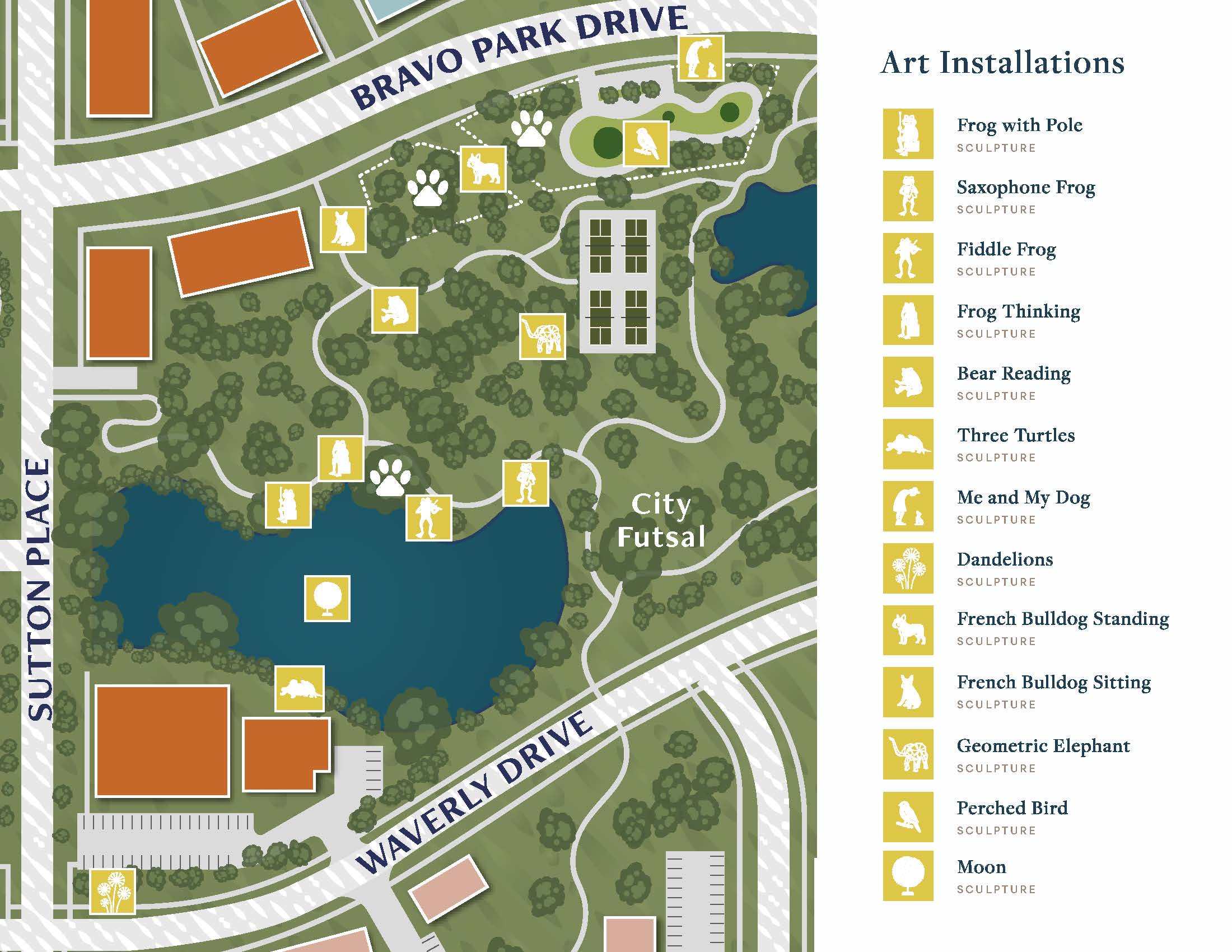 Anchored by a serene lake and laced with nature trails, Bravo Park invites morning jogs, midday breaks, and golden-hour strolls. Sculptural art installations spark inspiration, while pickleball courts and a dedicated dog park bring energy and connection to every corner.